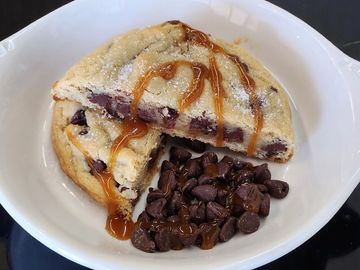 We call this our chocolate chip cookie on steroids.  We use our classic chocolate chip recipe and add a dab of gooey hot fudge in the center for an added kick.